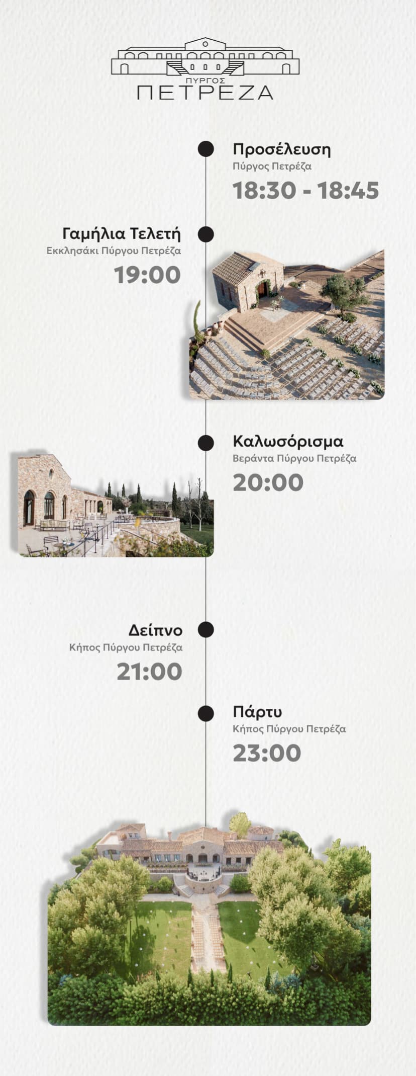 Εμείς και οι οικογένειές μας σας καλούμε για να γιορτάσουμε τον γάμο μας το Σάββατο 28 Ιουνίου 2025 στον Πύργο Πετρέζα.